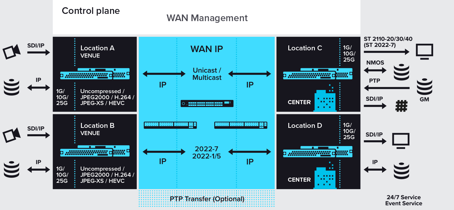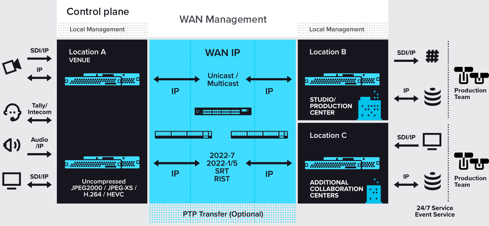 Contents transferred between multiple locations over contribution IP networks, especially from Venue to Production Centers